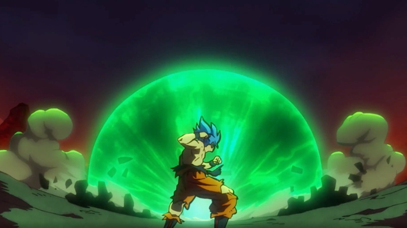 A seguir, Goku transformando-se em Super Saiyajin e Broly vai de encontro à ele para meter um belo socão. Vegeta se esforçando na medição de forças barrando as mãos do inimigo e logo depois Goku ativando o Super Saiyajin God.