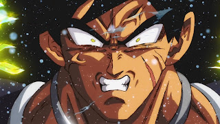 Sobre a cena inicial em si, as montanhas cobertas de neve são explodidas por Broly fazendo despejar lava por toda parte e Goku emerge flutuando na espera de um próximo golpe com uma luz verde iluminando por cima dele representando o ki de Broly. O desastre nem se alastrou e Goku ainda está em SSJ Blue, indicando que o negócio anda desvantajoso pra dedéu.